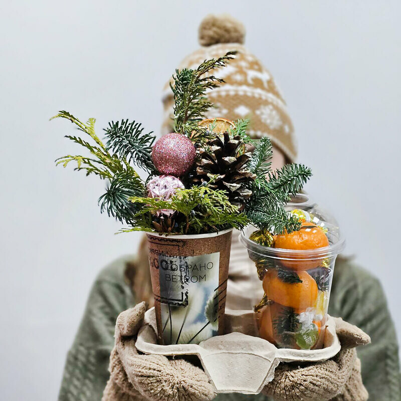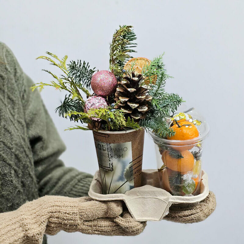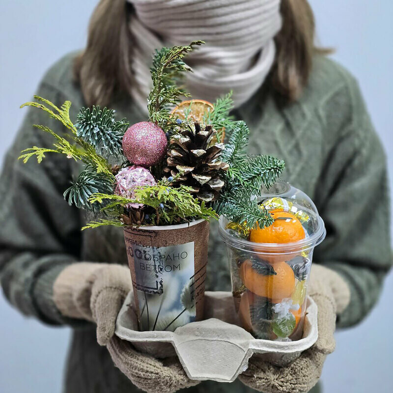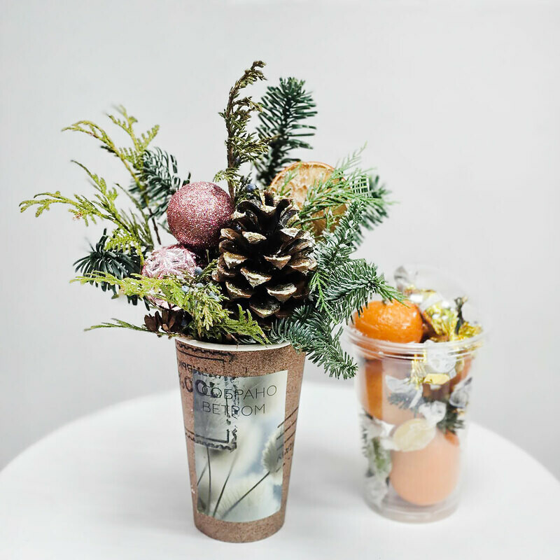 Новогодний презент «Хвоя и мандарины» от флористического салона «Талисман Флора» — отличный выбор для настоящих ценителей оригинального декора! Основу композиции составляют свежие веточки нобильюса, мандарины в симпатичных стаканчиках и аккуратные шишки. Все элементы упакованы в прозрачную упаковку, раскрывающую красоту композиции. Это прекрасный подарок для близких, друзей и коллег, полный тепла и любви к празднику! Если ищете уникальные идеи для новогодних презентаций, выбирайте наши новогодние композиции — они принесут массу положительных эмоций и создадут неповторимую атмосферу зимнего волшебства!