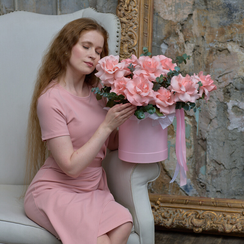 11 розовых эквадорских роз в шляпной коробке, стандартный