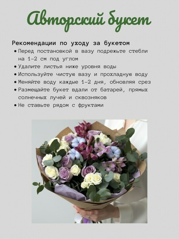 БесплатноАссортимент букетов зависит от города: Москва (внутри МКАД)