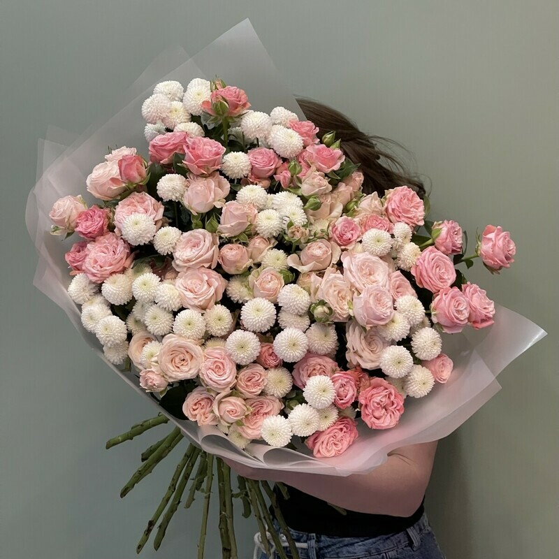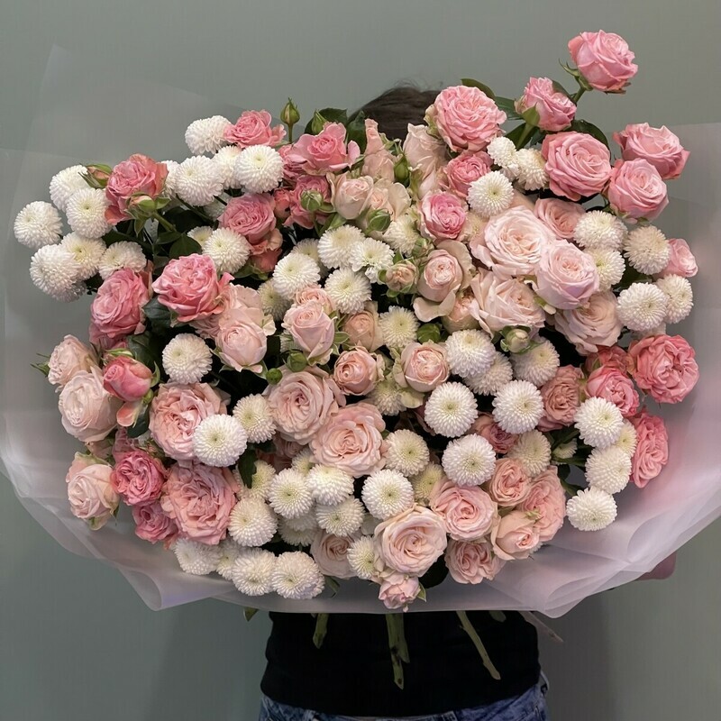 Уникальный букет из пионовидные кустовые роз и премиум хризантем