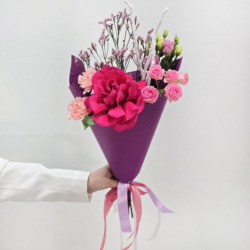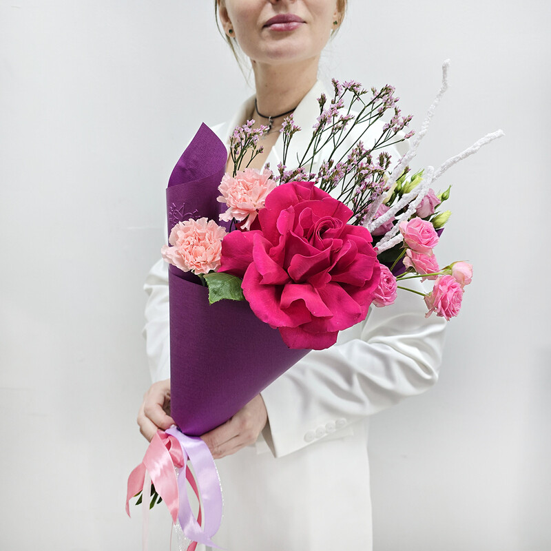 Букет из розы сорта Пинк Флойд, лимониума, гвоздики и лизиантуса в стильной упаковке от флористического салона «Талисман Флора» — это воплощение нежности и изысканности. Роза Пинк Флойд — символ любви и страсти, она создает атмосферу романтики и уюта. Её нежные лепестки и приятный аромат придают букету особую изысканность и элегантность. Гвоздика — олицетворение стойкости и стойкости, она добавляет букету свежести и легкости. Стильная упаковка подчеркивает изысканность букета, делая его идеальным подарком для любого случая. Этот букет станет прекрасным выбором для тех, кто ценит простоту и изысканность. Он добавит нотку спокойствия и гармонии в ваш день, напоминая о красоте и простоте природы.