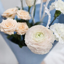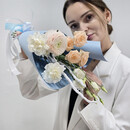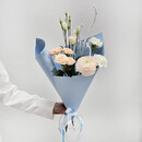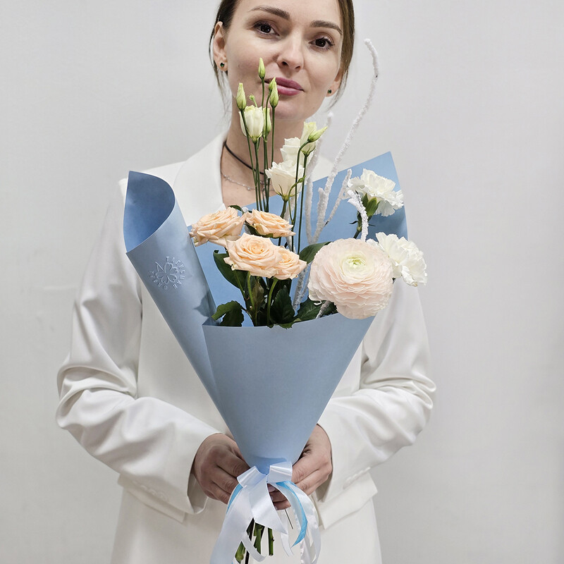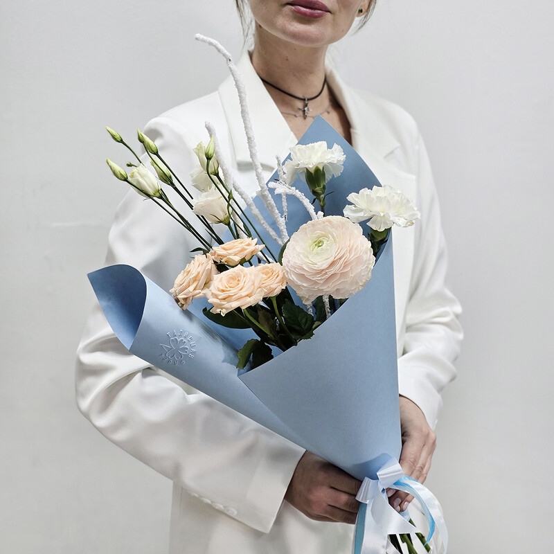 Букет комплимента из ранункулюса, лизиантуса, гвоздики и листьев черничника в небесно-голубой упаковке от флористического салона «Талисман Флора» — это воплощение нежности и изысканности. Ранункулюс — нежный и романтичный цветок, он добавляет композиции мягкости и утонченности. Его кремовый оттенок с розовым оттенком создает ощущение легкости и воздушности. Лизиантус — нежный и романтичный цветок, он добавляет композиции мягкости и утонченности. Его кремовый оттенок с розовым оттенком создает ощущение легкости и воздушности. Гвоздика — олицетворение стойкости и стойкости, она добавляет букету свежести и легкости. Небесно-голубая упаковка подчеркивает изысканность букета, делая его идеальным подарком для любого случая. Этот букет станет прекрасным выбором для тех, кто ценит простоту и изысканность. Он добавит нотку спокойствия и гармонии в ваш день, напоминая о красоте и простоте природы.