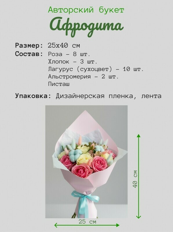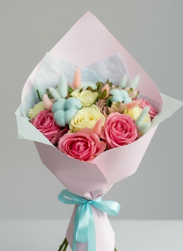- Букет с розами и хлопком «Афродита»