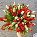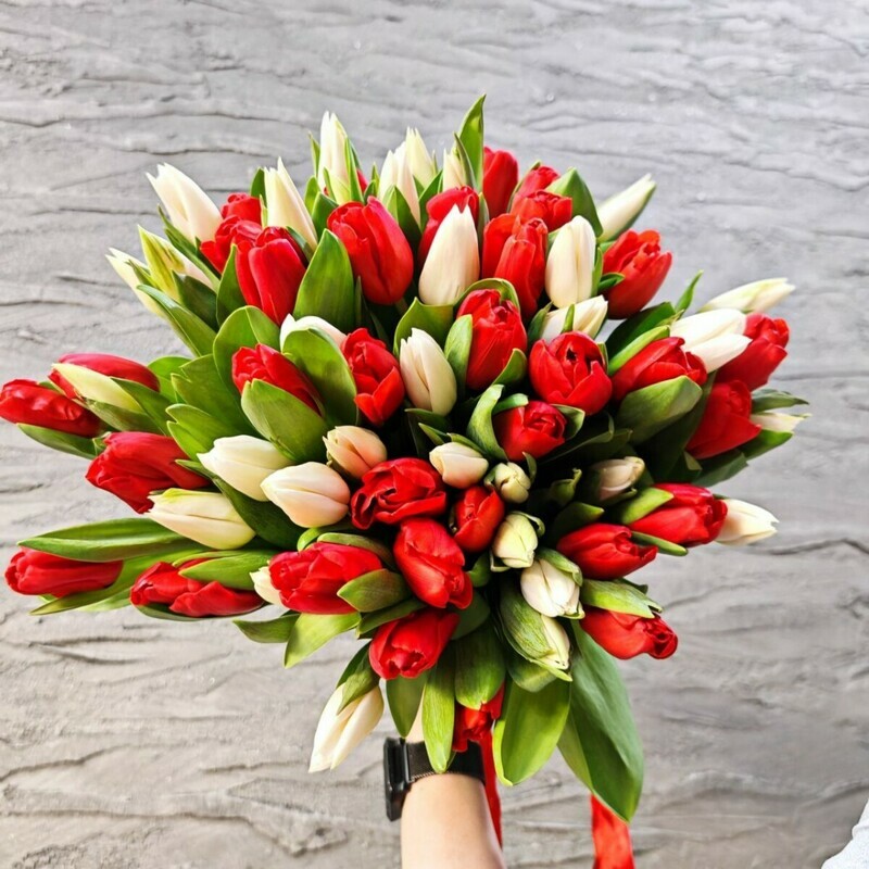 Большой букет 65 красных и белых тюльпанов. Цветы тюльпаны на 8 марта