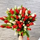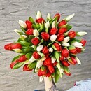 Большой букет 65 красных и белых тюльпанов. Цветы тюльпаны на 8 марта, стандартный