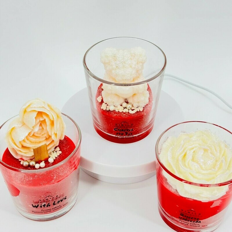 Интерьерная ароматизированная свеча в стакане ручной работы "Мишка из ро с сердцем"1 990 ₽ СтандартныйДобавить к товару