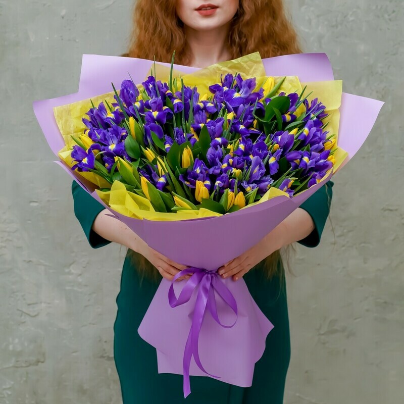 Синие ирисы и желтые тюльпаны в авторской упаковке GRAND