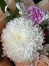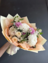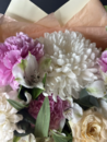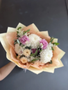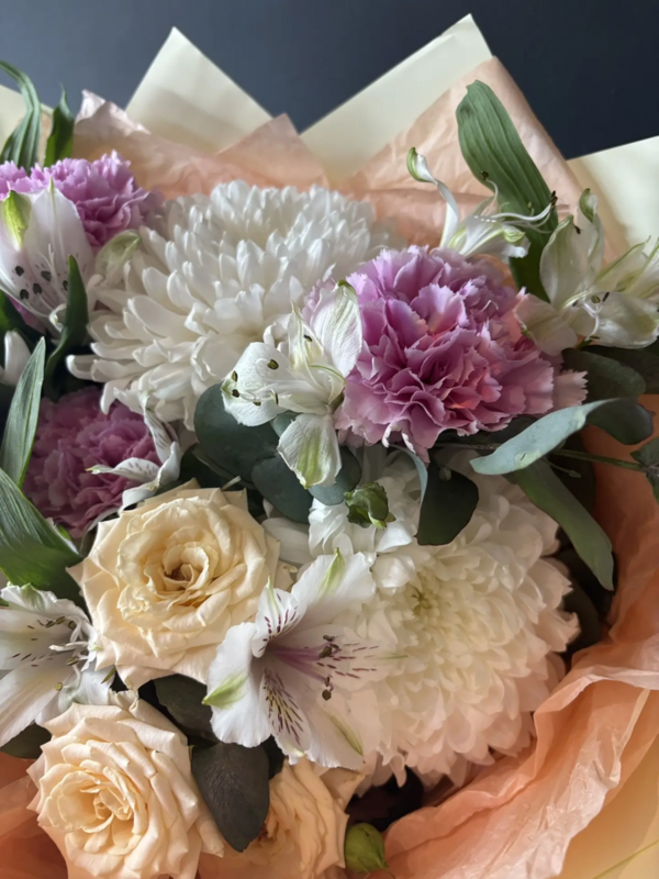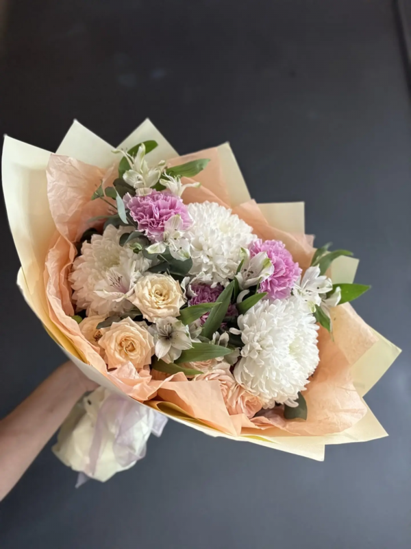 - Букет с хризантемой, гвоздикой и кустовой розой