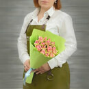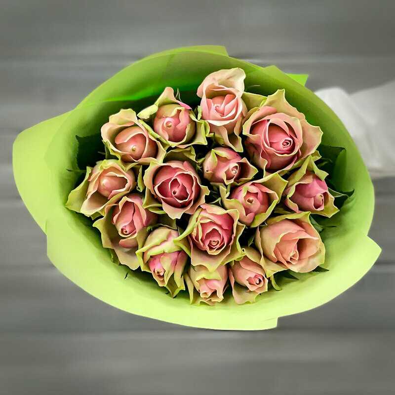 Букет из 13 зелено-розовых роз в упаковке Кения 40 см., стандартный