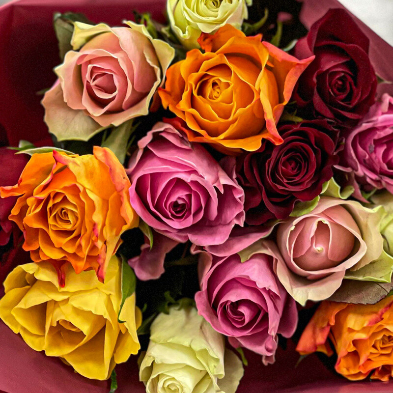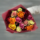 Букет из 13 разноцветных роз в упаковке Кения 40 см.