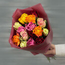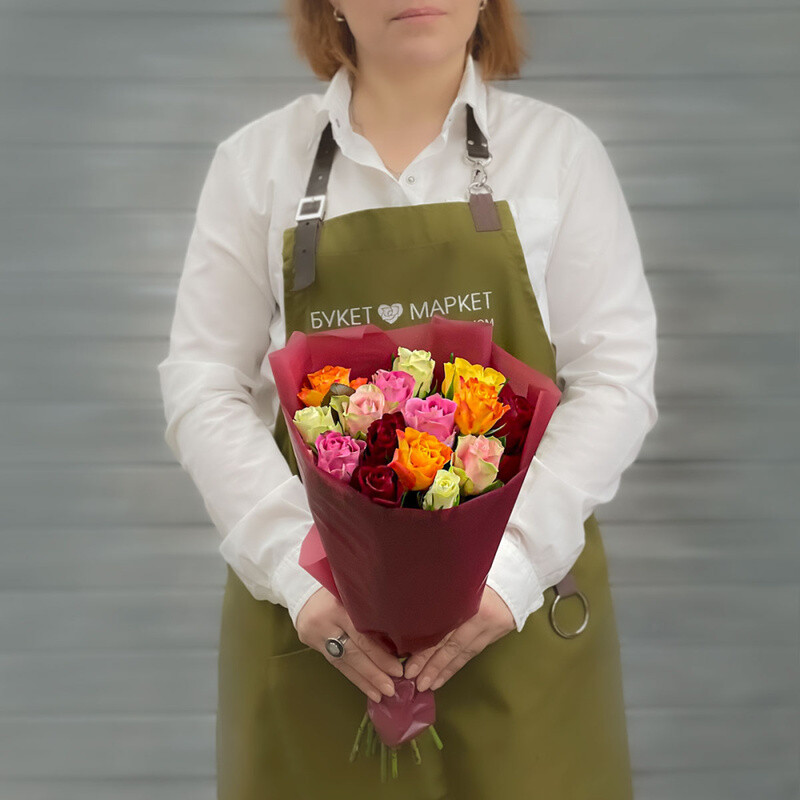 Букет из 13 разноцветных роз в упаковке Кения 40 см., стандартный
