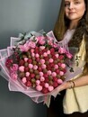 - Букет из клубники в шоколаде 75-85 шт с кустовой розой и эвкалиптом