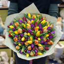 Букет из 101-го тюльпана разных цветов в дизайнерской бумаге крафт.
