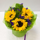 Букет из подсолнухов, статицы с декоративной зеленью в упаковке.