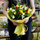 Букет из разноцветных фрезий с декоративной зеленью в дизайнерской бумаге крафт.