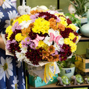 Букет из 39-ти кустовых разноцветных хризантем в крафте с декоративными бабочками