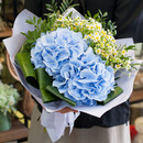 Букет цветов в бело-голубой гамме из голубых гортензий, мелкой кустовой ромашки с декоративной зеленью в подарочной упаковке. Очень красивый и необычный букет для подарка летом. Так же получателем подарка может быть любой человек как мужчина, так и женщина, как молодая девушка, так и ребенок.