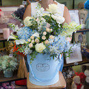 Шляпная коробка в бело-голубой гамме из гортензий, орхидей фаленопсис, белых пионов, белых калл, кремовых кустовых роз, белой маттиолы, гвоздики, эквадорских белых роз премиум класса, а так же с эвкалиптом и декоративной зеленью.