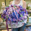 Корзина из гортензий, орхидей "Ванда", лунной гвоздики, фрезий, эустомы, матиоллы, альстромерии, кустовой хризантемы с эвкалиптом.