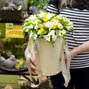 Нежная, ароматная и просто очень красивая композиция в шляпной коробке с весенними цветами- фрезиями (35 шт) в бело-желтой гамме.
