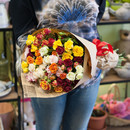 Букет из разноцветных кустовых роз в бумаге крафт.