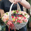 Корзинка с ягодами (клубникой 500 гр., малиной 125 гр., голубикой 125 гр., ежевикой 125 гр.) и цветами.