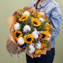 Букет из подсолнухов, белых пионов, синей вероники с декоративн6ой зеленью в дизайнерской упаковке.