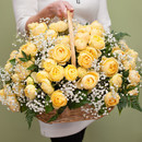 Корзина из желтых пионовидных роз, гипсофилы с декоративной зеленью в подарочной упаковке.