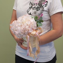 Небольшая композиция в шляпной коробке из розовой гортензии с лентами.