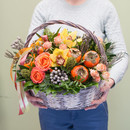 Корзинка в оранжевых тонах из роз, кустовых роз, орхидей, брунии и других цветов и зелени, в качестве декора - свежая хурма.