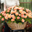 Корзина из 101-ой персиковой розы с декоративной зеленью в корзине.