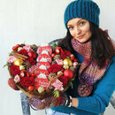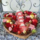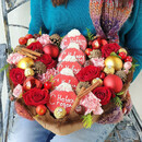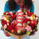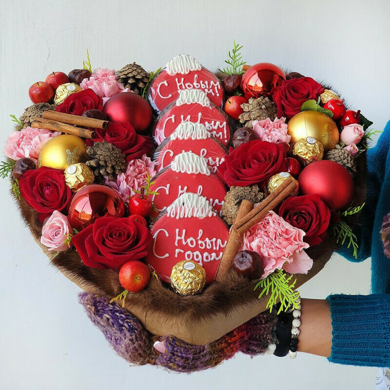 Шикарный подарок в зимнее время для ваших знакомых и важных людей. Вкуснейшее печенье ручной работы в виде новогодних шариков и конфеты Ферро Роше порадует любителей вкусного и сладкого. А зимнее настроение создаст композиция в форме сердца из роз, живой хвои и новогоднего декора. Дарите вашим знакомым и близким радостные эмоции.