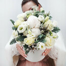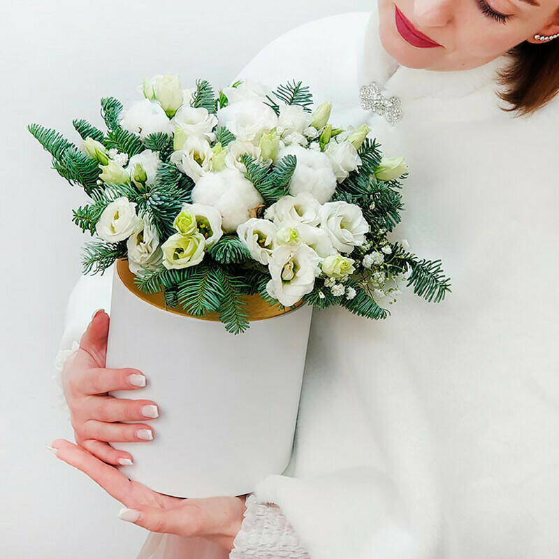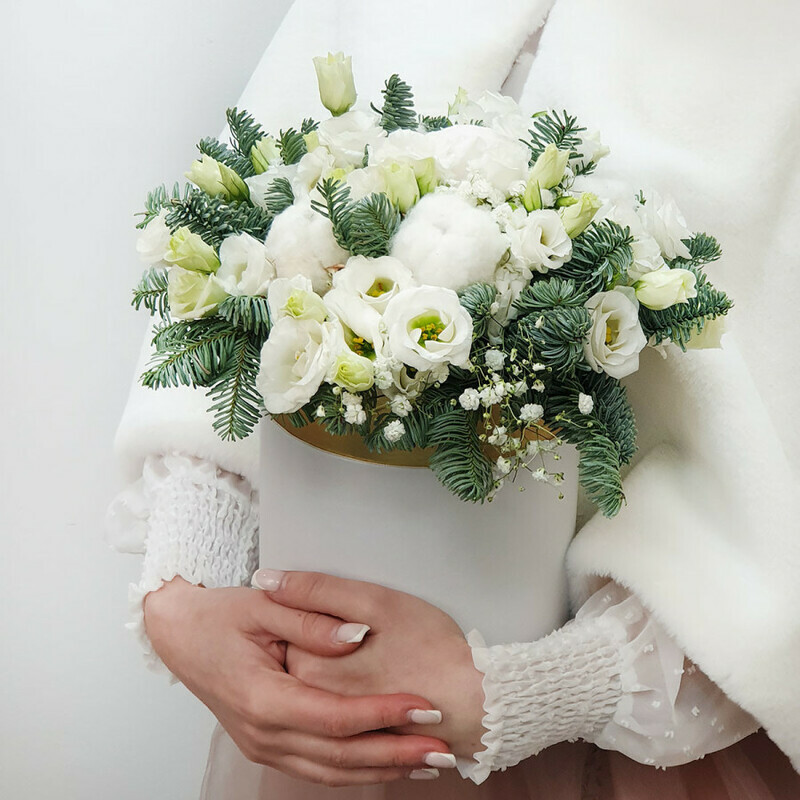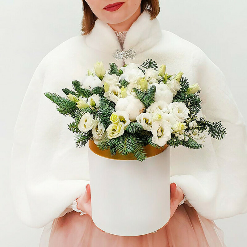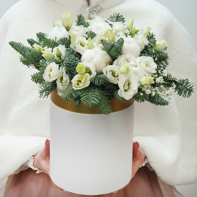 Зимняя композиция в шляпной коробке из роз, капса и нобилиса, стандартный