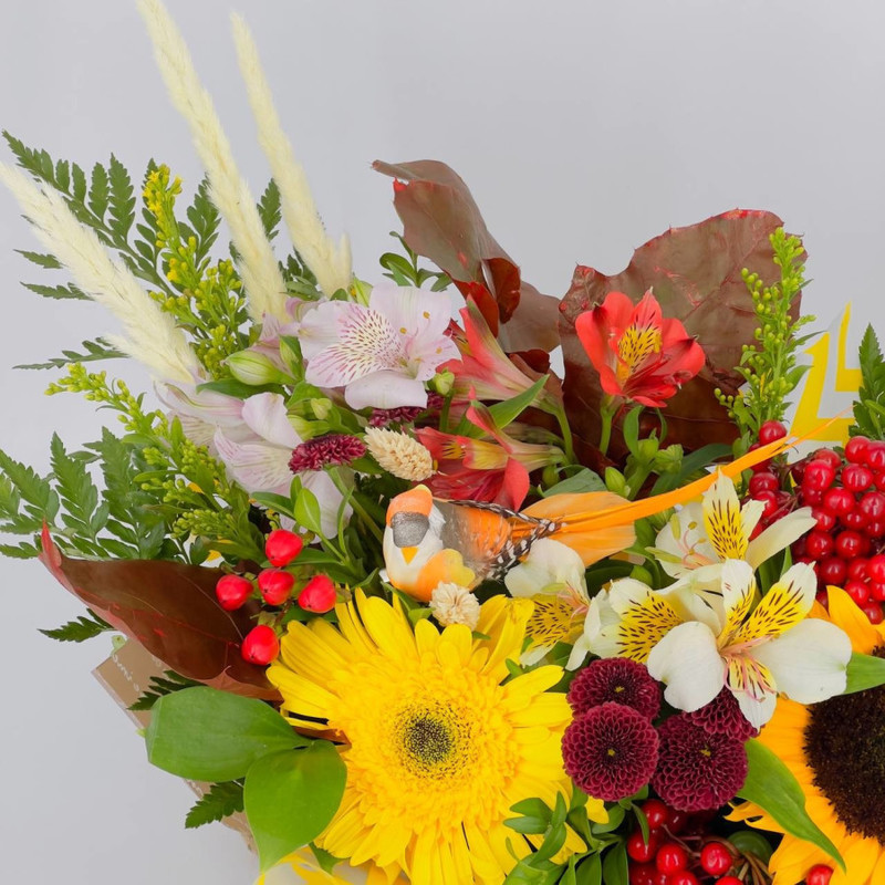 Осенний букет в вязаном кашпо с подсолнухом, стандартный