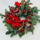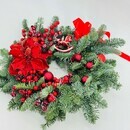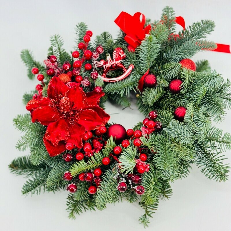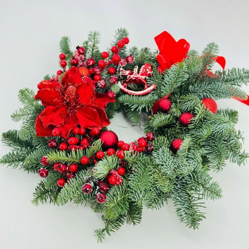 Новогодний рождественский венок 50 см из натурального нобилиса с лошадкой и красным декором, стандартный