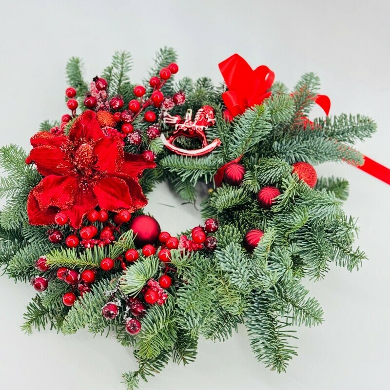 Новогодний рождественский венок 50 см из натурального нобилиса с лошадкой и красным декором