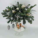 Веточки нобилиса, с ёлочными игрушками, тематическими новогодними фигурками, в стеклянном бокале, тематическим декором это стильное и эффектное оформление букета.