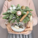 Веточки нобилиса, с ёлочными игрушками, тематическими новогодними фигурками, в стеклянном флорариуме, тематическим декором это стильное и эффектное оформление букета.