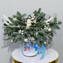 Веточки нобилиса, с ёлочными игрушками, тематическими новогодними фигурками, в стеклянной вазе, тематическим декором это стильное и эффектное оформление букета.