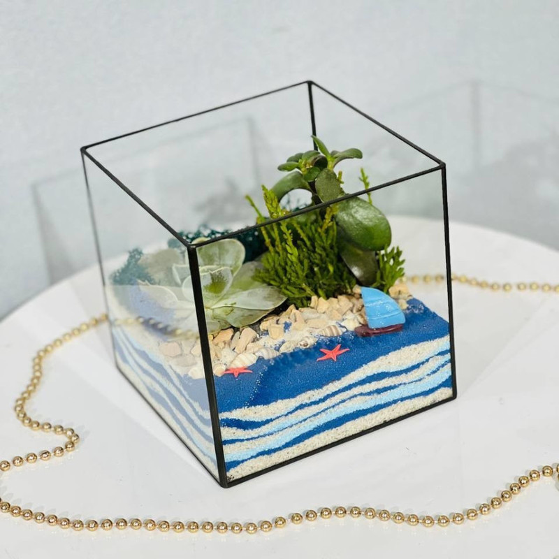 Флорариумы моссариумы из стекла, с живыми растениями, начали набирать особенную популярность в последние года: они не занимают много места, красиво смотрятся и не нуждаются в особой заботе, так как микроклимат внутри сосуда формируется самими растениями. Такой подарок идеально подойдёт для тех, кто не любит ухаживать за цветами или попросту некогда, отлично впишется в интерьер офиса. Мини-аквариум флорариум декорируется натуральными материалами такими как камни, ракушки, цветной песок, стабилизированный мох и неприхотливыми растениями такими как кактус, суккулент, толстянка, хавортия, эхеверия. Флорариум это лучшая альтернатива срезанным цветам, которые завянут через несколько дней. Это прекрасный подарок для мамы, бабушки, учителя, любимой девушки, для всех тех, кто любит живые цветы. Это необычный подарок на свадьбу, новоселье, день рождения, новый год и любой другой праздник. Маленький ботанический мир, впишется в любой интерьер и будет радовать долгое время.