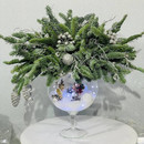 Веточки нобилиса, с ёлочными игрушками, тематическими новогодними фигурками, в стеклянном бокале, тематическим декором это стильное и эффектное оформление букета.