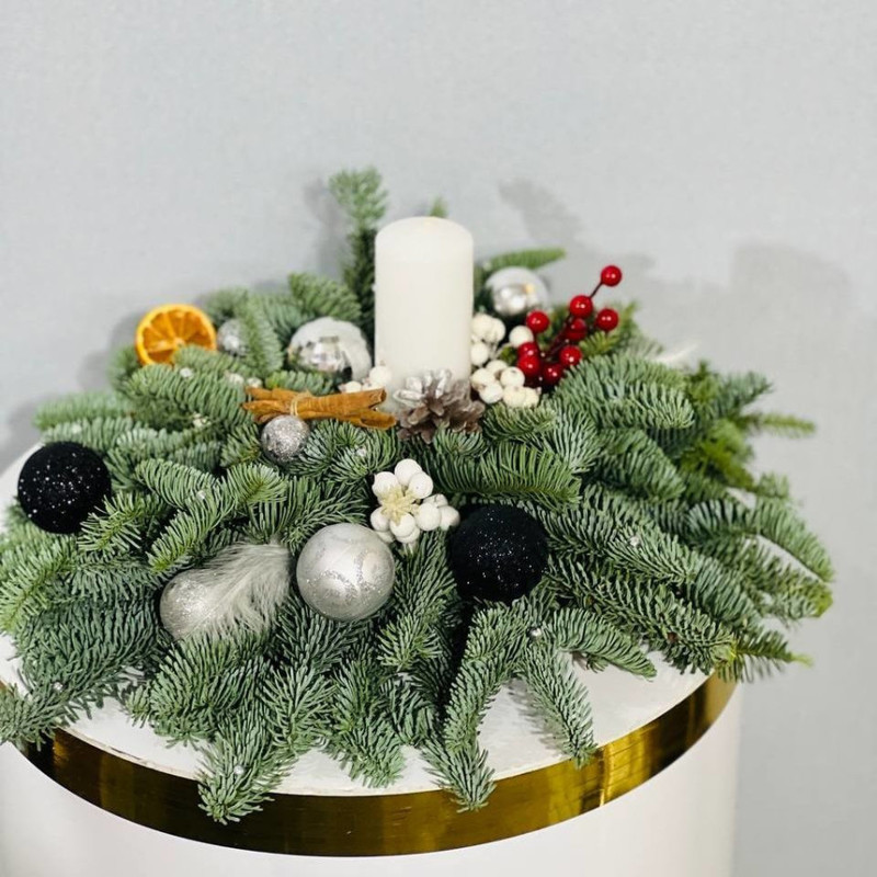Настольная композиция из натуральной хвои нобилис со свечой, стандартный