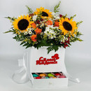 Коробка-сюрприз с цветами и макарони. Альстромерия, подсолнух, танацетум, роза кустовая, вибурнум, стандартный