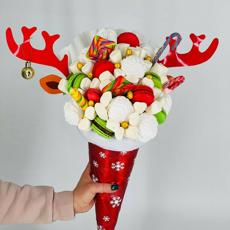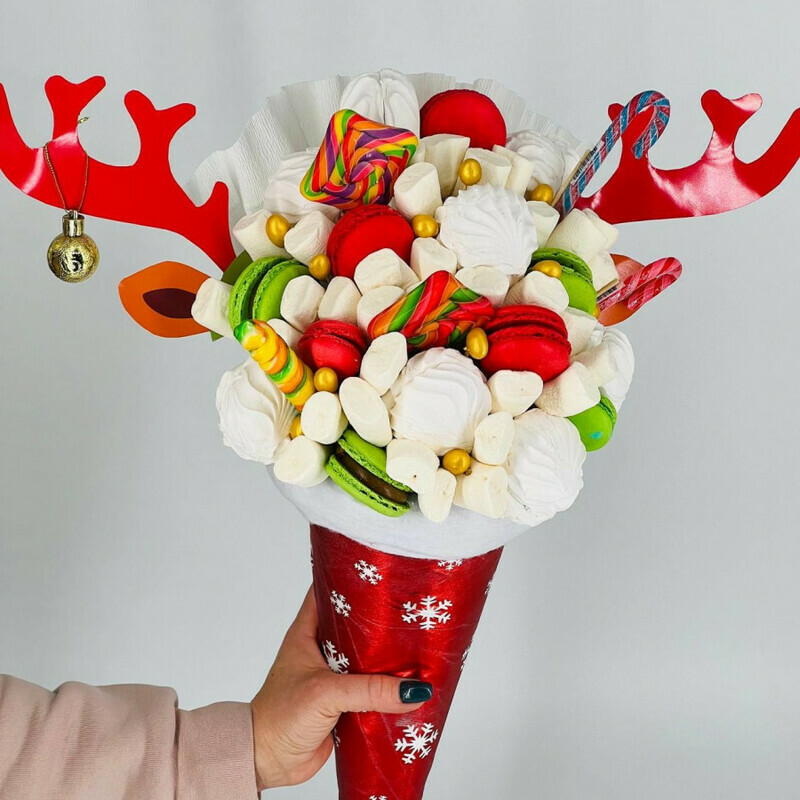На Новый год принято дарить сладкие подарки, а мы предлагаем преподнести яркий, вкусный и тематический букет, который не оставит равнодушным никого.
