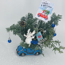 Новогодняя композиция в кашпо автомобиль с фигуркой лосик. Букет из нобилиса