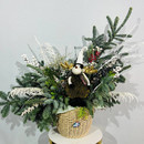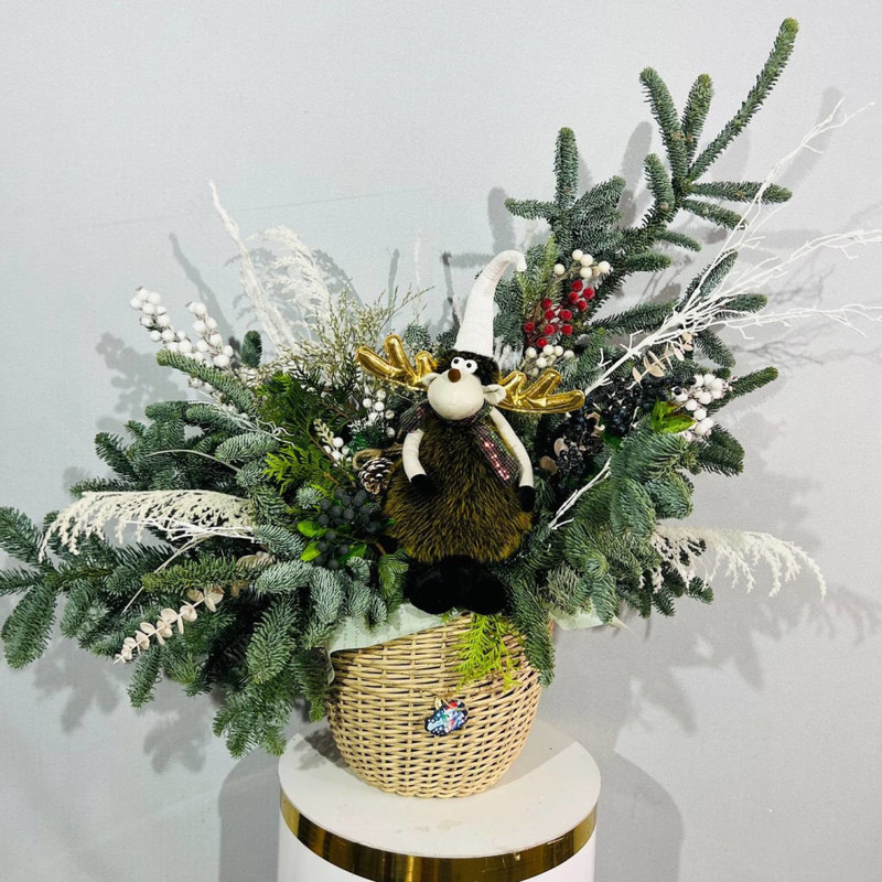 Не нужно ждать, когда вас посетит праздничное настроение – его можно создать при помощи наших зимних композиций из натурального нобилиса, с дополнением из декора и интерьерной игрушки ручной работы в виде новогоднего лося.