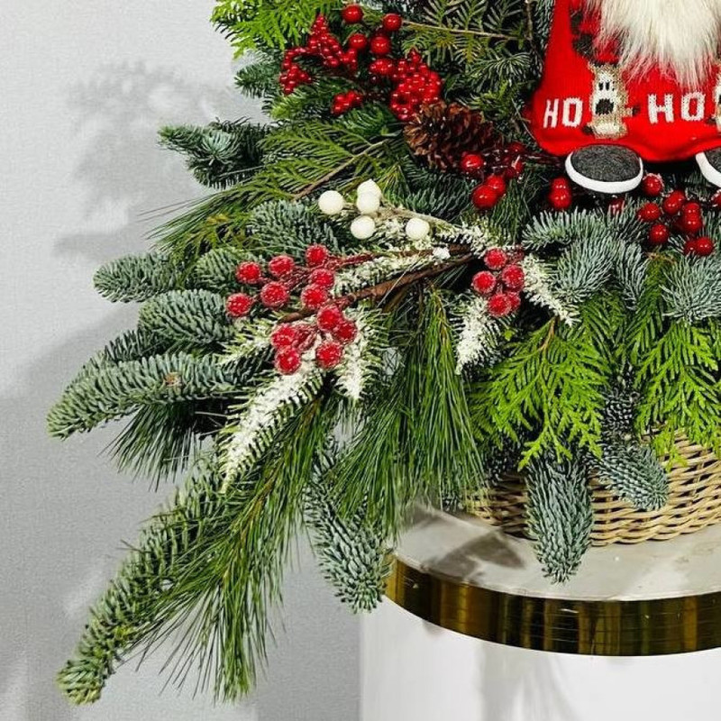 Еловая композиция для украшения улицы дома в кашпо из искусственного ротанга с нобилис