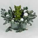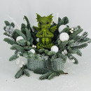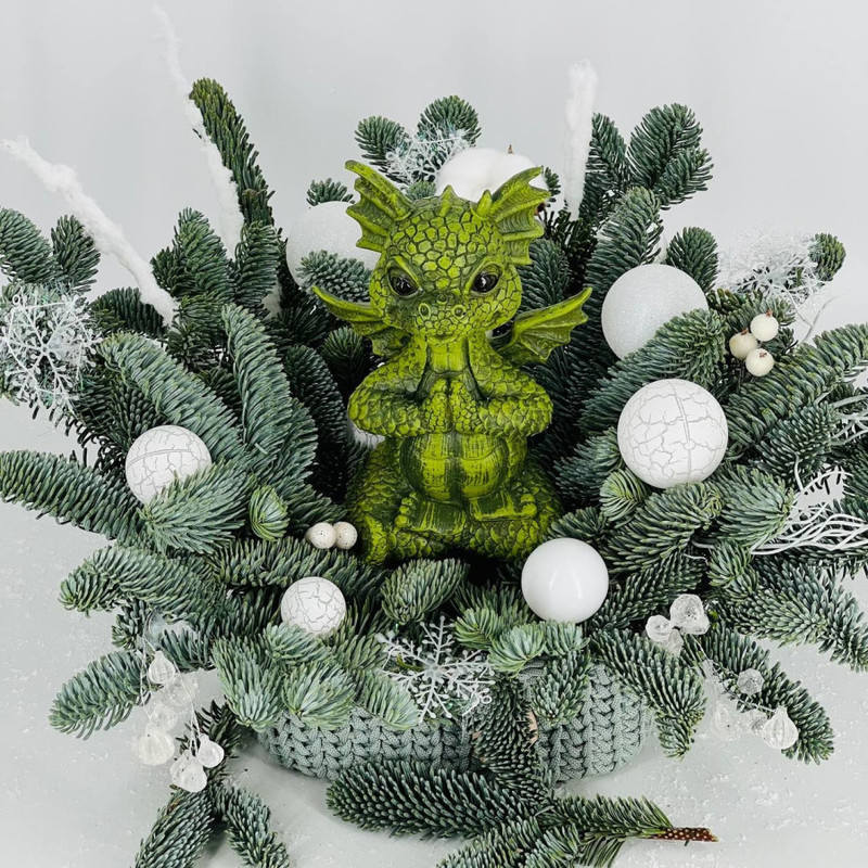 Новогодняя композиция идеально дополнит новогодний интерьер дома и офиса. Это отличный способ задекорировать интерьер дома, дачи, коттеджа или офиса под Новый год и Рождество. Такая композиция будет отлично смотреться в ресторане, кафе, галерее и любом другом помещении общественного пользования. Новогодняя композиция на стол из натуральной хвои, усыпанная елочными шарами с сувениром в виде дракона, станет идеальным дополнением к новогоднему столу. Мы предлагаем вашему вниманию то, что отлично впишется в любой интерьер и не потребует от Вас внимания и ухода. Новогодняя композиция на стол, отлично подходит для небольших квартир и помещений. Если вам нужна идея для необычного и оригинального подарка близким и друзьям, то букет из нобилиса это то, что вам нужно для того, чтобы порадовать себя и близких.