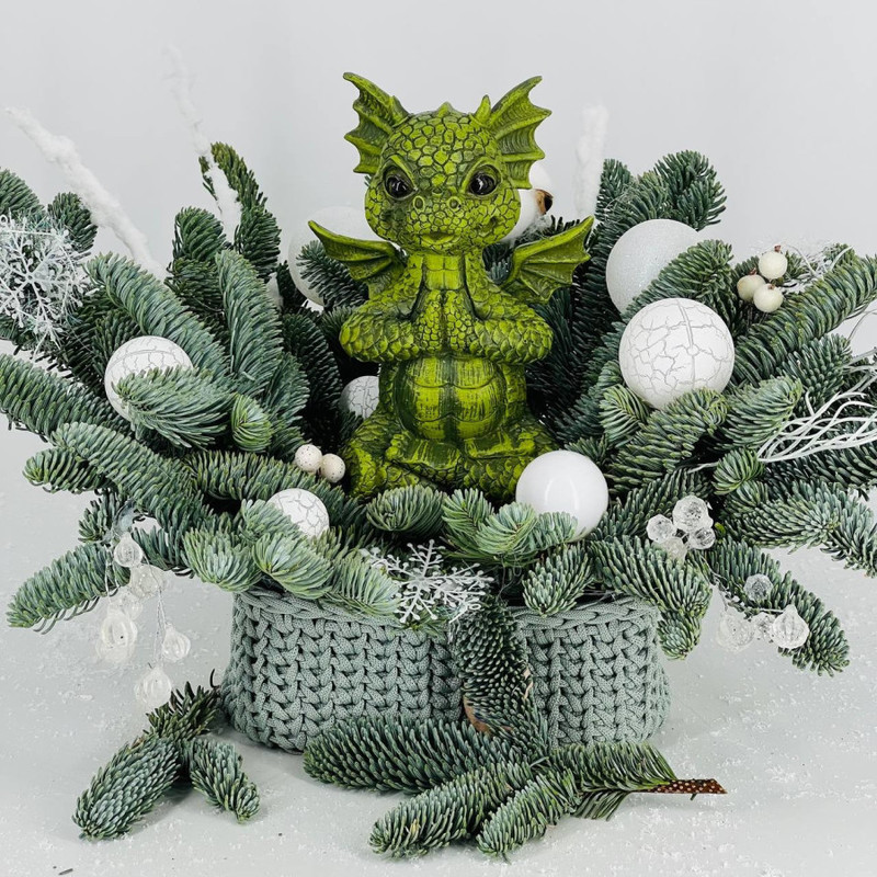 Новогодняя композиция из живой хвои нобилис в вязаном кашпо с дракончиком