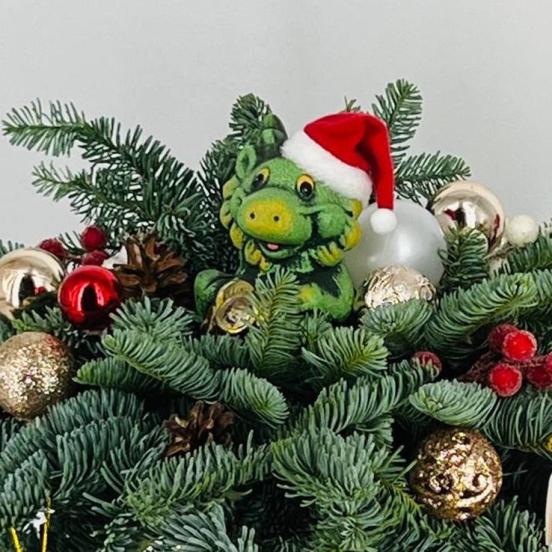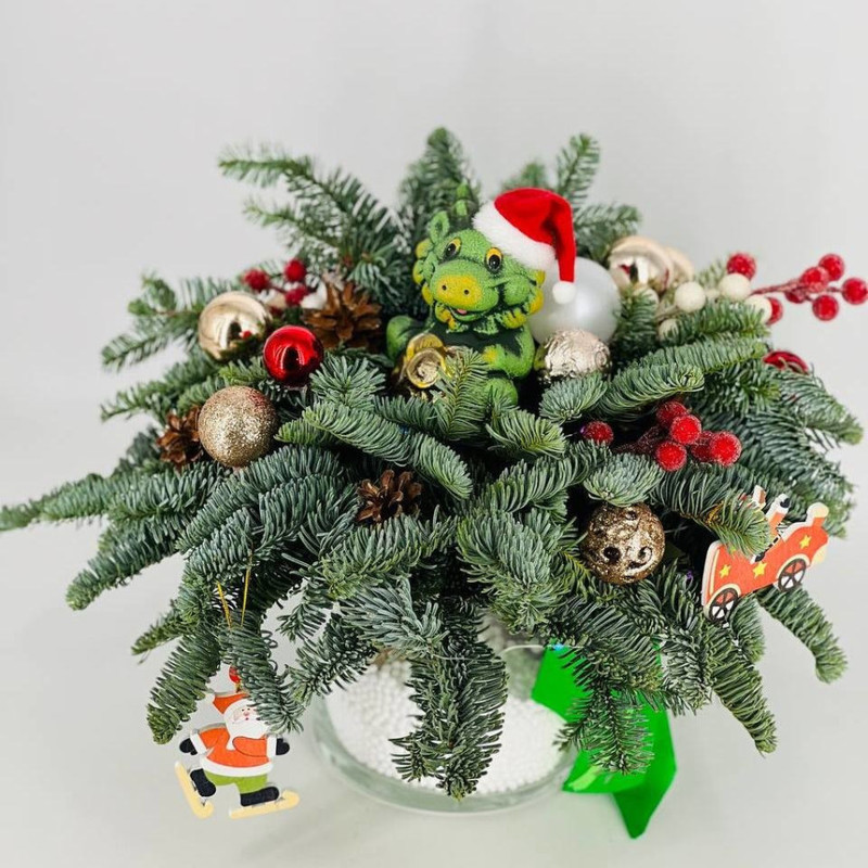 Авторский букет из живой хвои нобилис в стекле с сувениром денежный дракон, стандартный